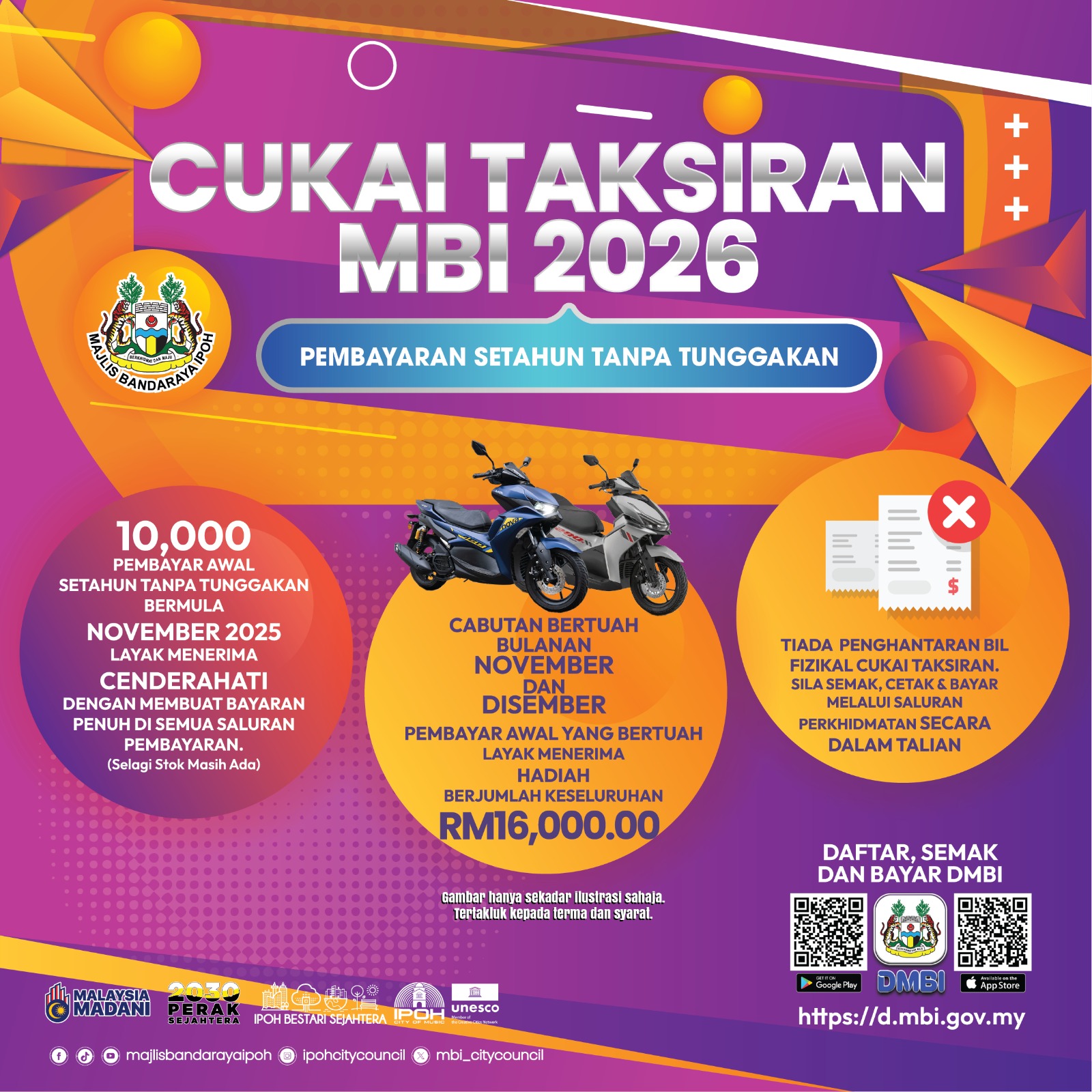 Win a motorcycle prize in the Monthly Lucky Draw November & December 2025 Edition worth a total of RM16,000 by making an immediate payment via: