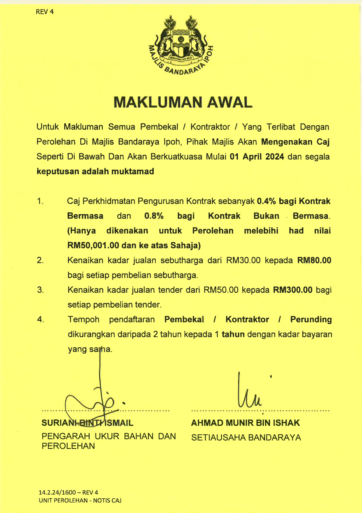 NOTIS MAKLUMAN BERKAITAN KADAR BARU CAJ KEPADA PEMBEKAL & KONTRAKTOR MBI