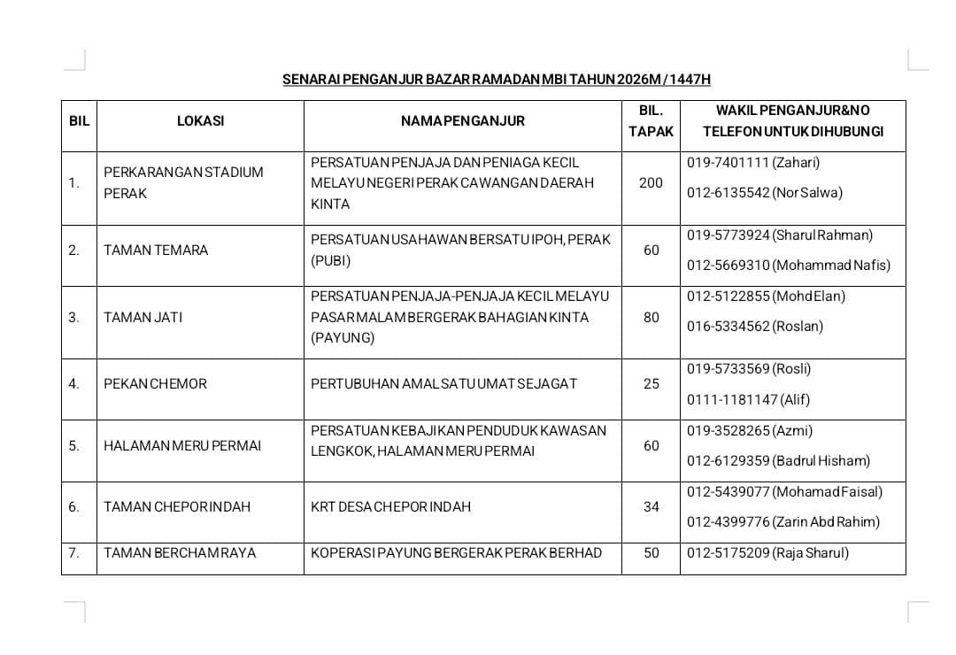 22 Disember 2025 - Majlis Bandaraya Ipoh telah meluluskan hak penganjuran kepada 6 Persatuan Penjaja, 3 Persatuan Penduduk, 2 AJK Masjid/Surau, 1 Koperasi Penjaja, dan 2 agensi swasta sebagai Penganjur Bazar Ramadan untuk 23 lokasi bagi tahun 2026M/1447H.