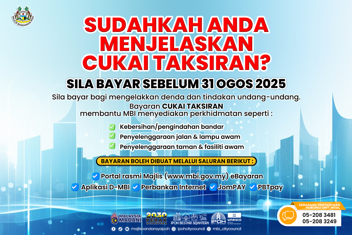 Hakcipta Terpelihara © 2023 Majlis Bandaraya Ipoh (MBI). Sesuai dipapar menggunakan IE versi 9 & ke atas, Mozilla Firefox versi 6.0 ke atas dan Google Chrome 13.0 ke atas dengan resolusi 1024 x 768 ke atas. Kemaskini :